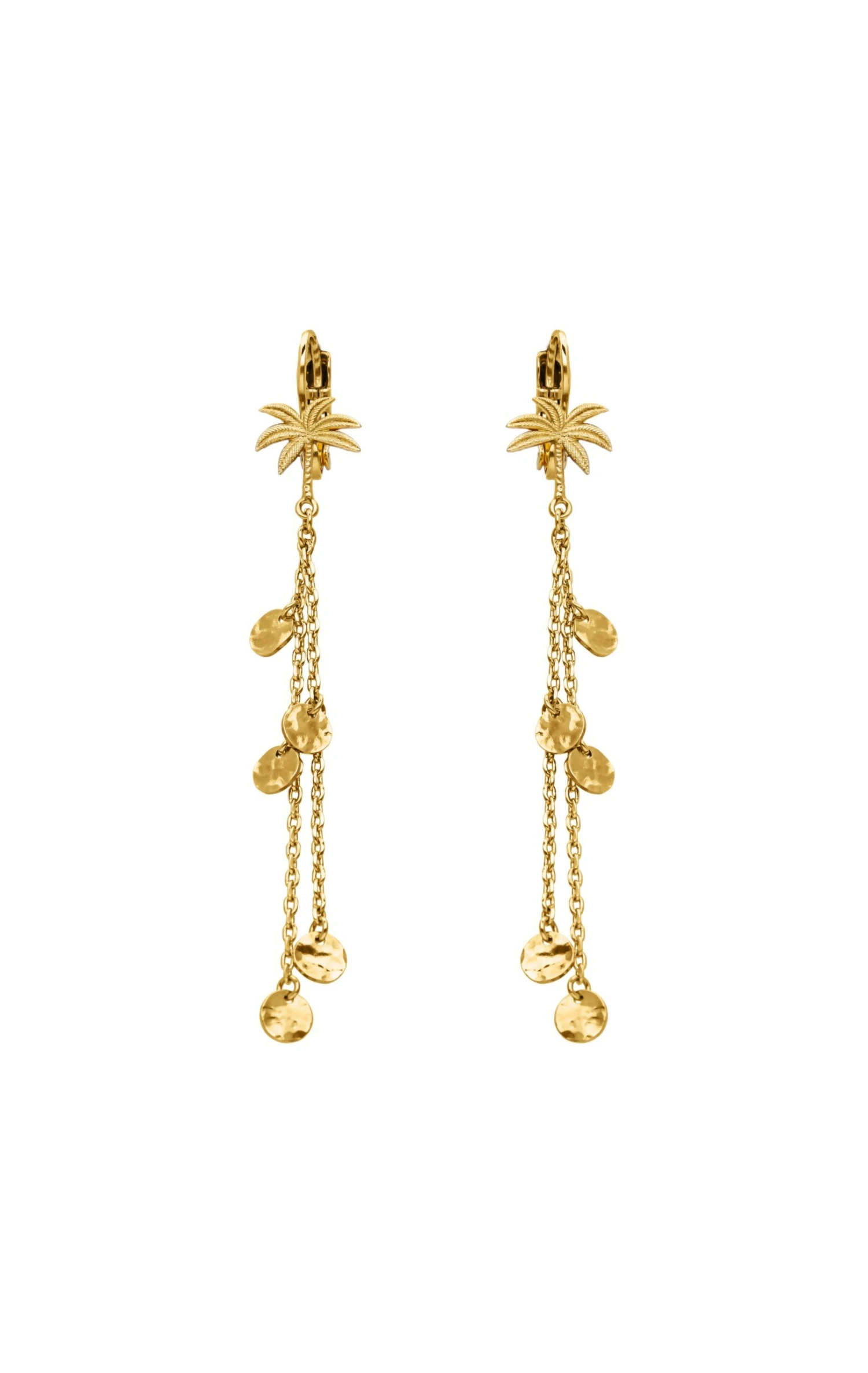 C’est bientôt l’été! Adoptez nos boucles d’oreilles dorées à l’or fin 23 carats, façon pendants. Montées sur une attache dormeuse pour oreilles percées, on retrouve les symboles signature d’Hipanema: en tête de boucle, un palmier délicatement ouvragé, sur lequel sont attachées deux petites chaînes forçat décorées de pampilles sequins. On adore ce thème minimaliste chic, élégant et ensoleillé.