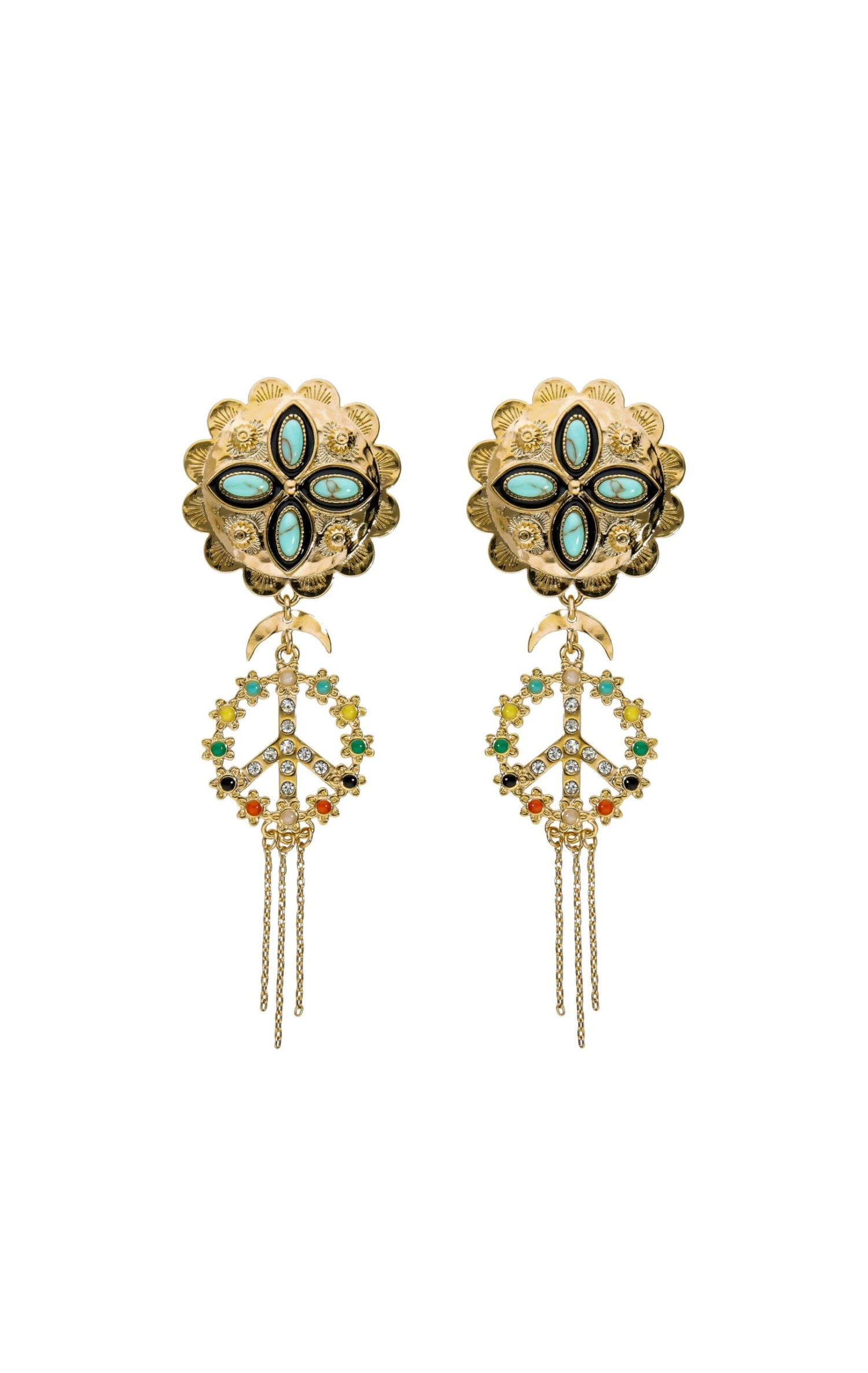 Osez le look retro baroque cet hiver! Ces boucles d’oreilles dorées à l’or fin 14 carats ont la particularité d’être montées sur clip pour oreilles non-percées. Elles sont décorées d’un cabochon solaire décoré d’une fleur noir et turquoise qui rappelle le somptueux travail de la tribu des Zunis. On adore le style Navajo, revisité de manière baroque, qui rend cette collection atypique et féminine.