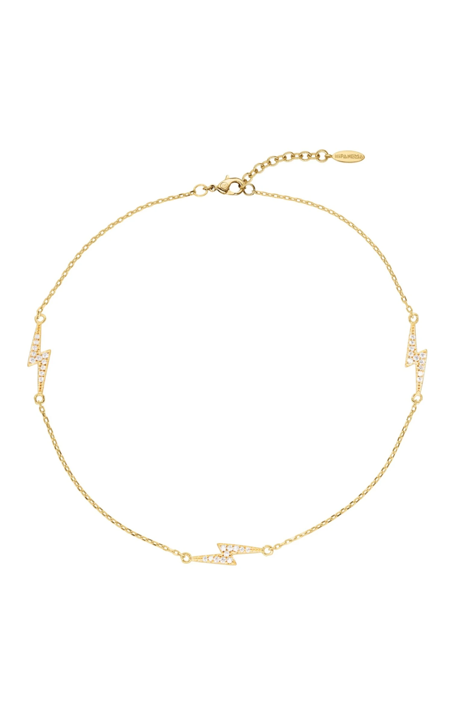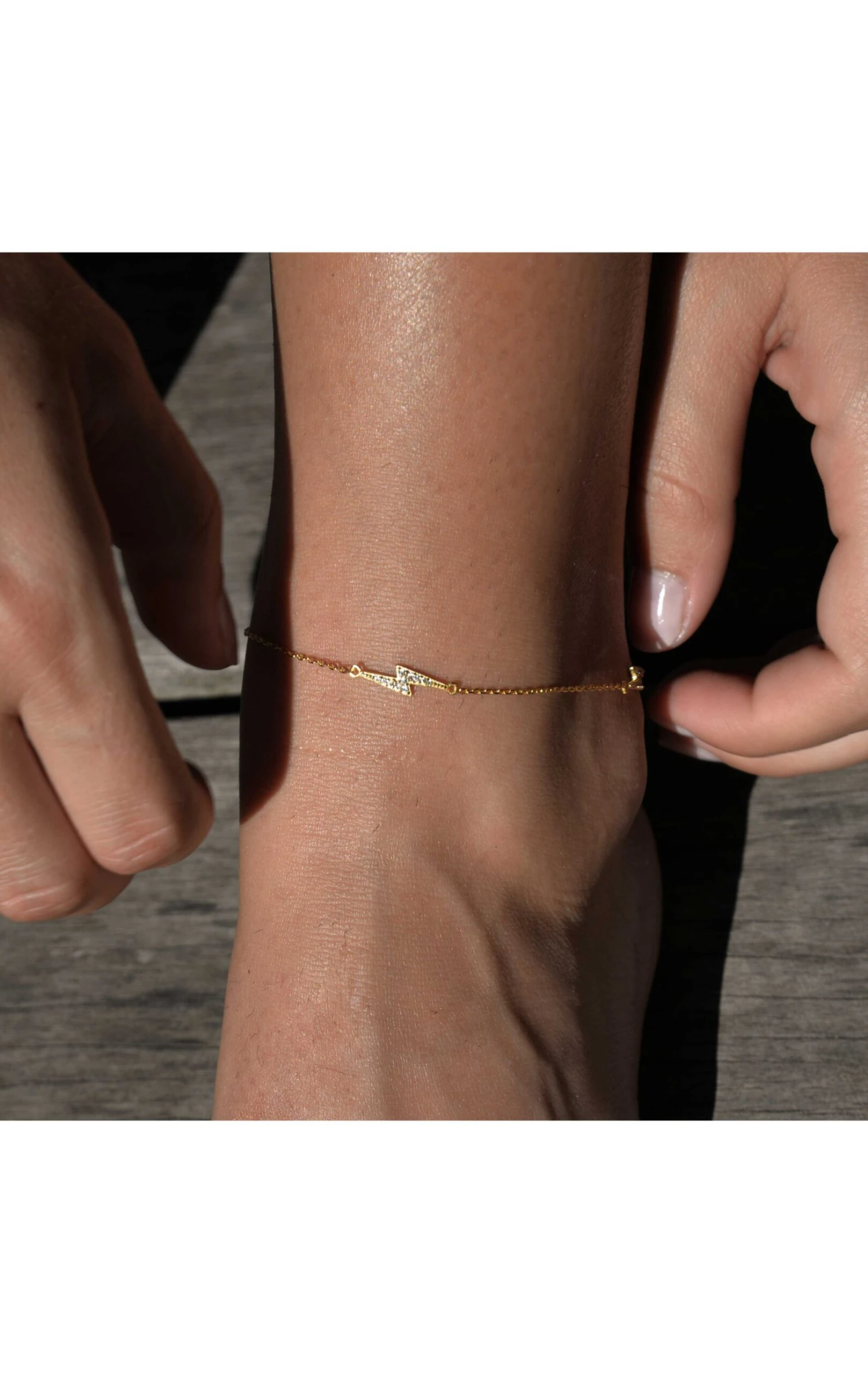 Chaîne de cheville dorée très simple, montée sur une chaîne forçat en vermeil, avec trois petits éclairs pavés de strass effet diamant pour un look classique mais rock à la fois.