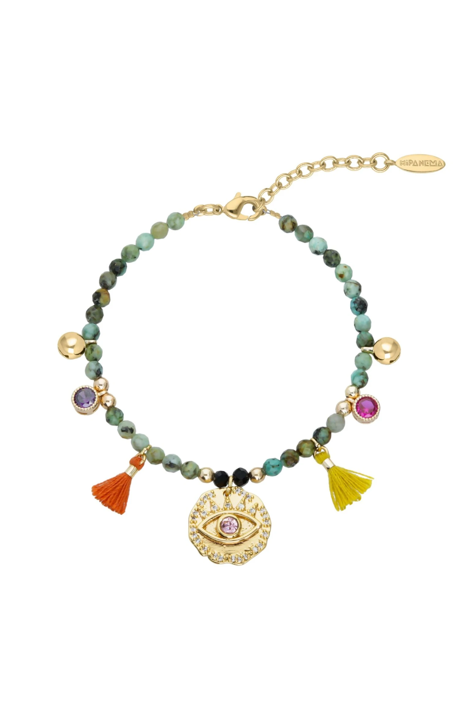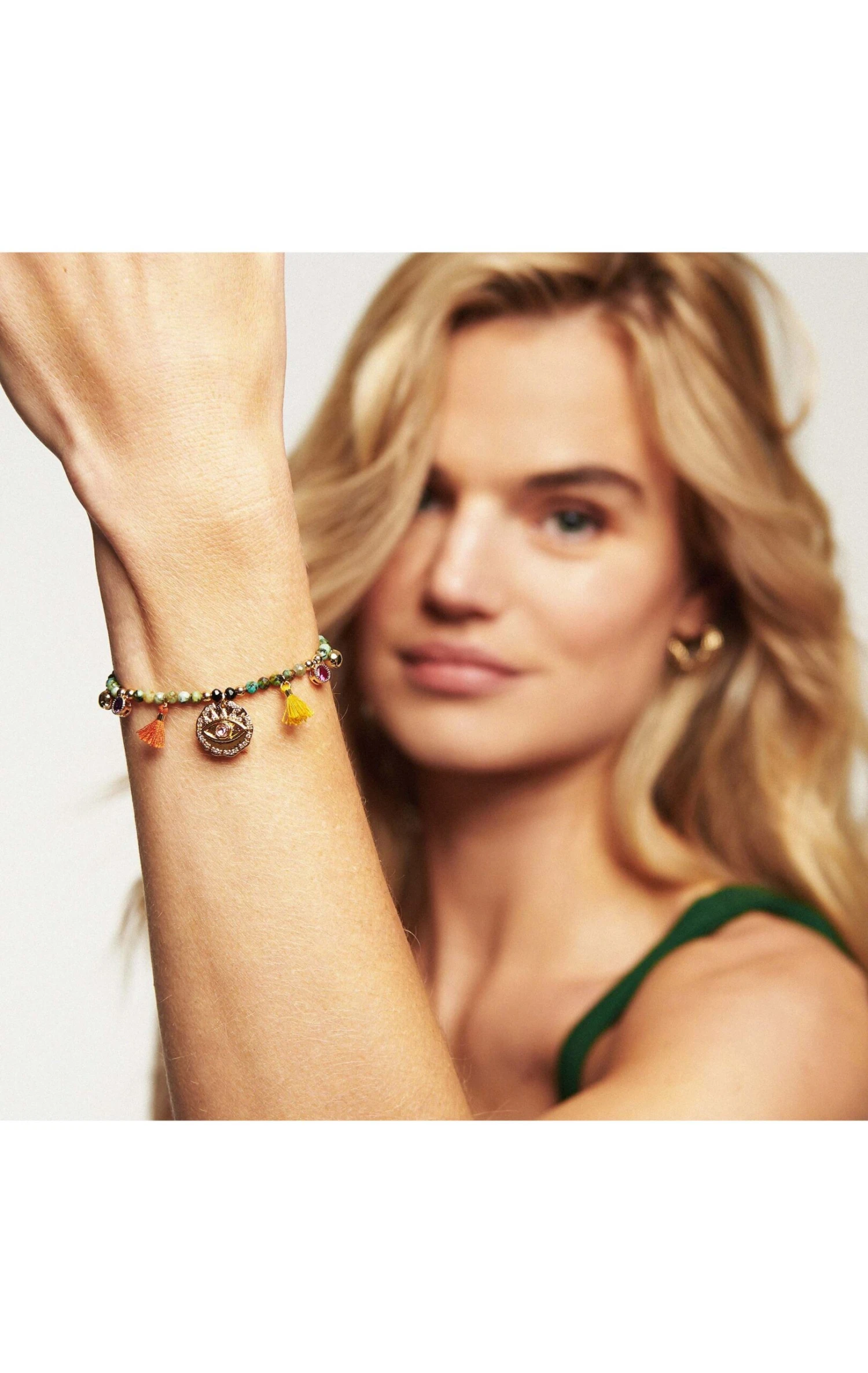 Cet hiver, vous aussi, craquez pour cette pièce précieuse et colorée à l’esprit résolument bohème! Ce petit bracelet doré à l’or fin 14 carats est entièrement constitué de pierres semi-précieuses dans les tons turquoise et noir. Il est décoré de petites pampilles multicolores avec en son centre une médaille représentant un œil intégralement pavée de strass effet diamant et d’un strass central rose. Il est également orné de deux petits pompons de couleur rouille et jaune, de deux petits grelots ainsi que de deux gouttes de couleur améthyste et rubis.