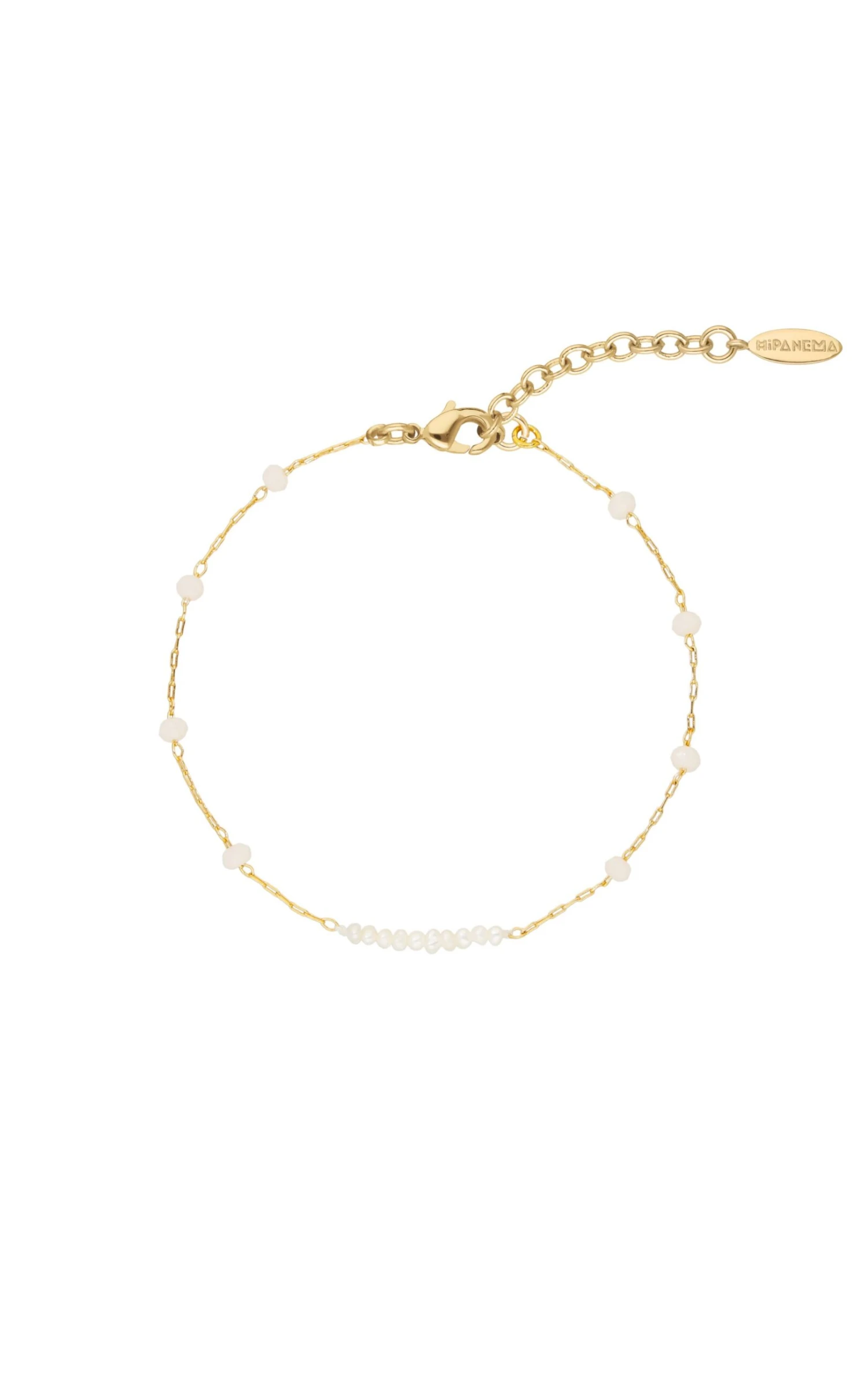 Adorable bracelet monté sur une chaîne chapelet dorée à l’or fin 18 carats. Au centre, des perles de culture véritables irrégulières pour un aspect brut et unique. Le bijou fait à la main qui revisite l’élégance façon beachwear.
