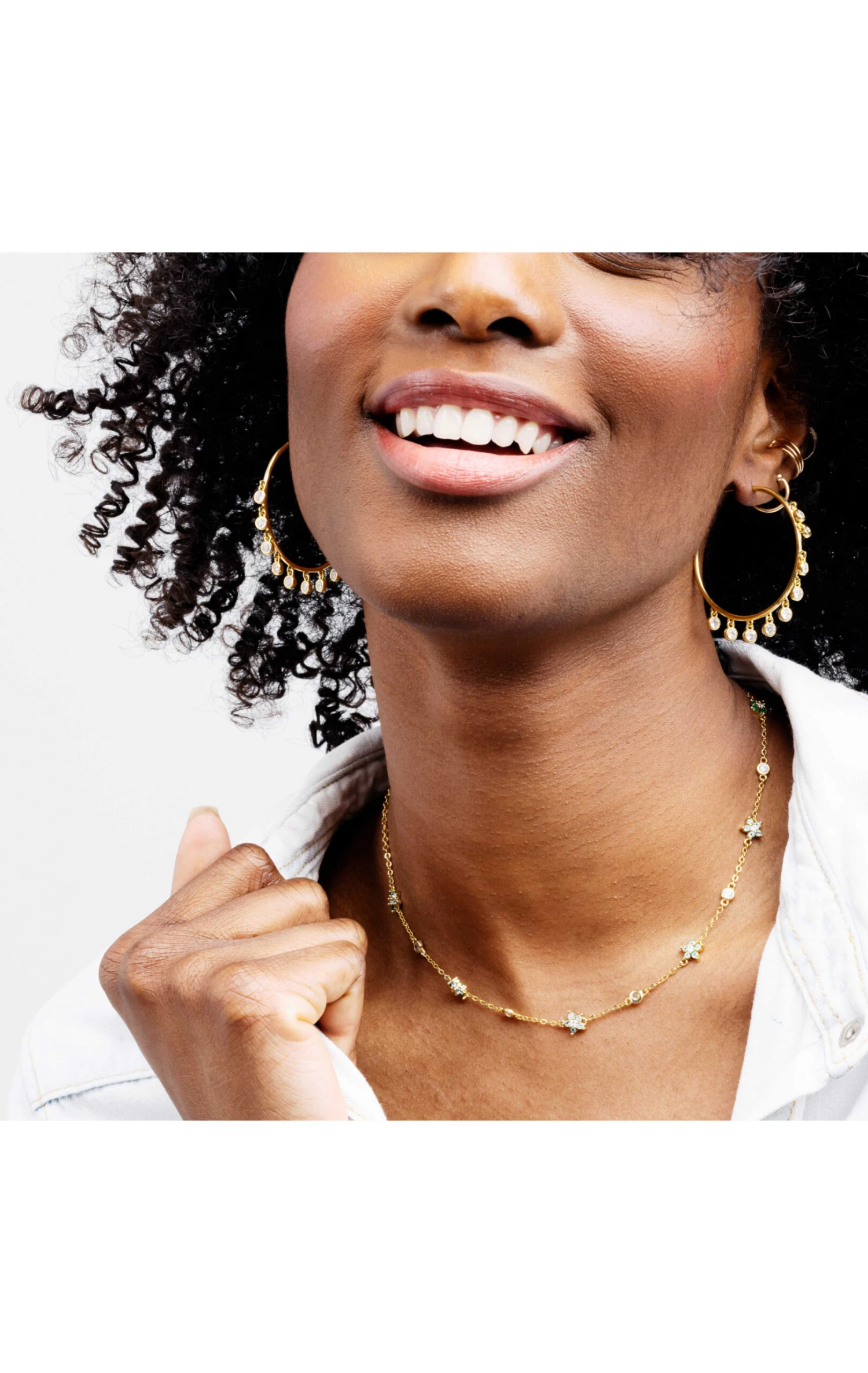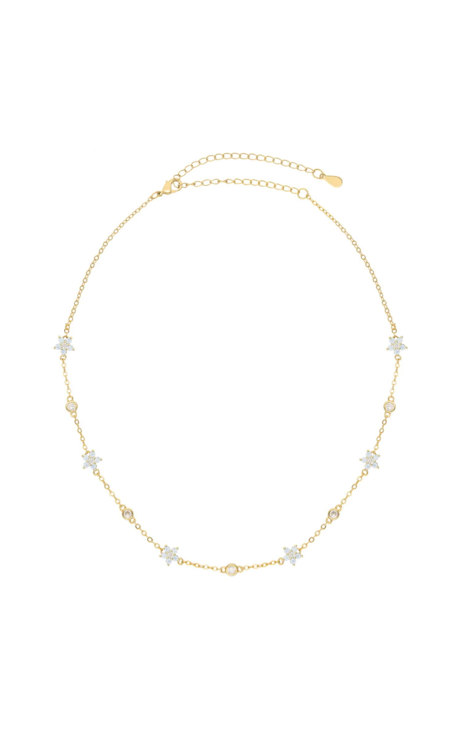 Collier dorĂ© Ă l’or fin 14 carats, sur une chaĂ®ne forçat ras de cou, ornĂ© de petites fleurs marguerites pavĂ©es de strass effet diamant, en alternance avec des petits ronds en strass effet diamant. IdĂ©al pour un look romantique.