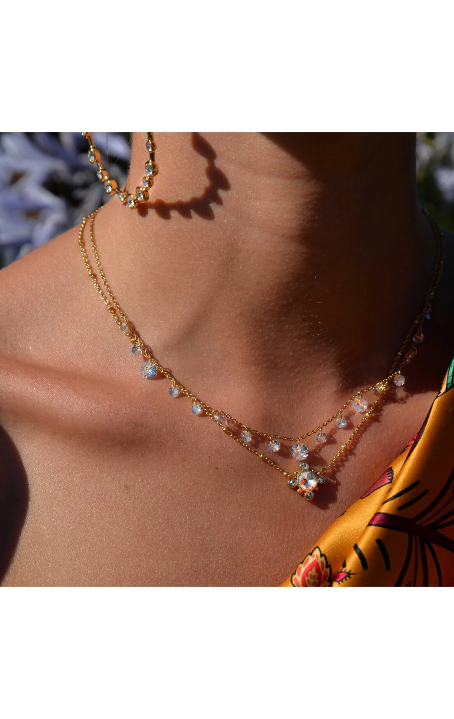 Ravissant collier d’inspiration Hollywood-Bollywood, avec une multitude de strass non sertis, de tailles différentes, sur une chaîne forçat dorée à l’or fin 18 carats. On adore ce rendu cascade de pierres blanches effet diamant. Ce bijou au raffinement aérien est fait à la main.