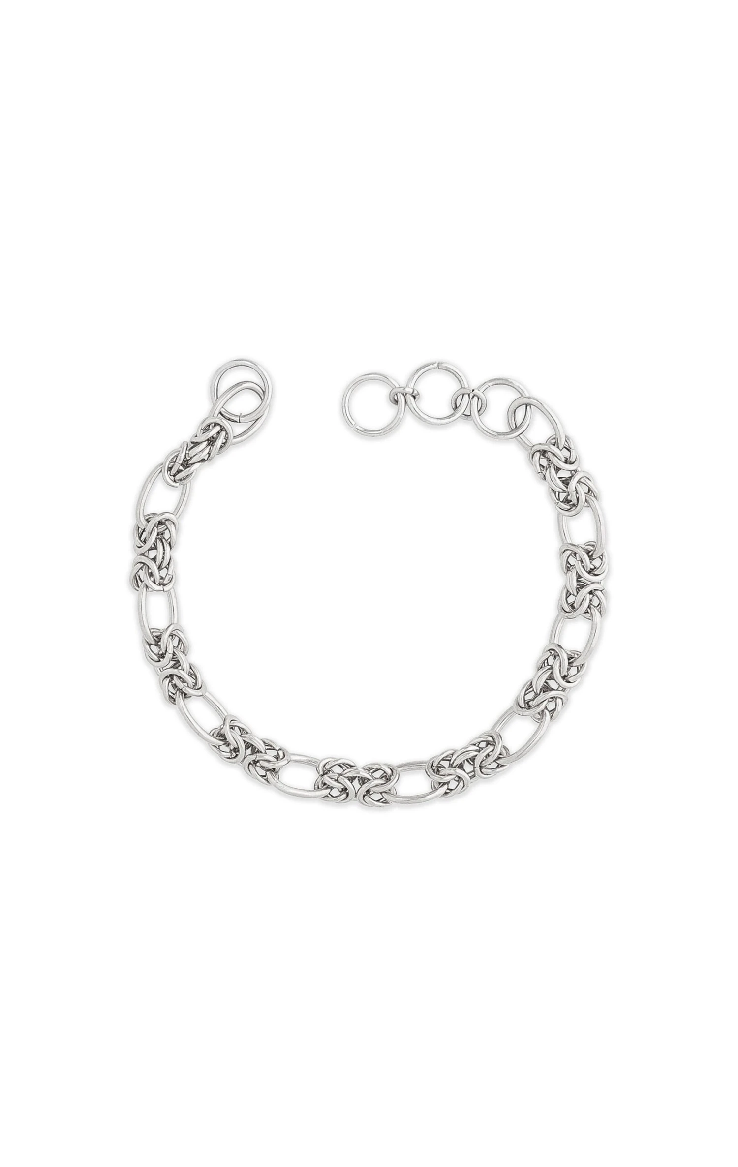 Les bracelets « CLARE » sont les liens en chaîne. Ici vous est présenté une chaîne épaisse de maille ovale, rattachée avec un maillon papillon, argentée au rhodium.