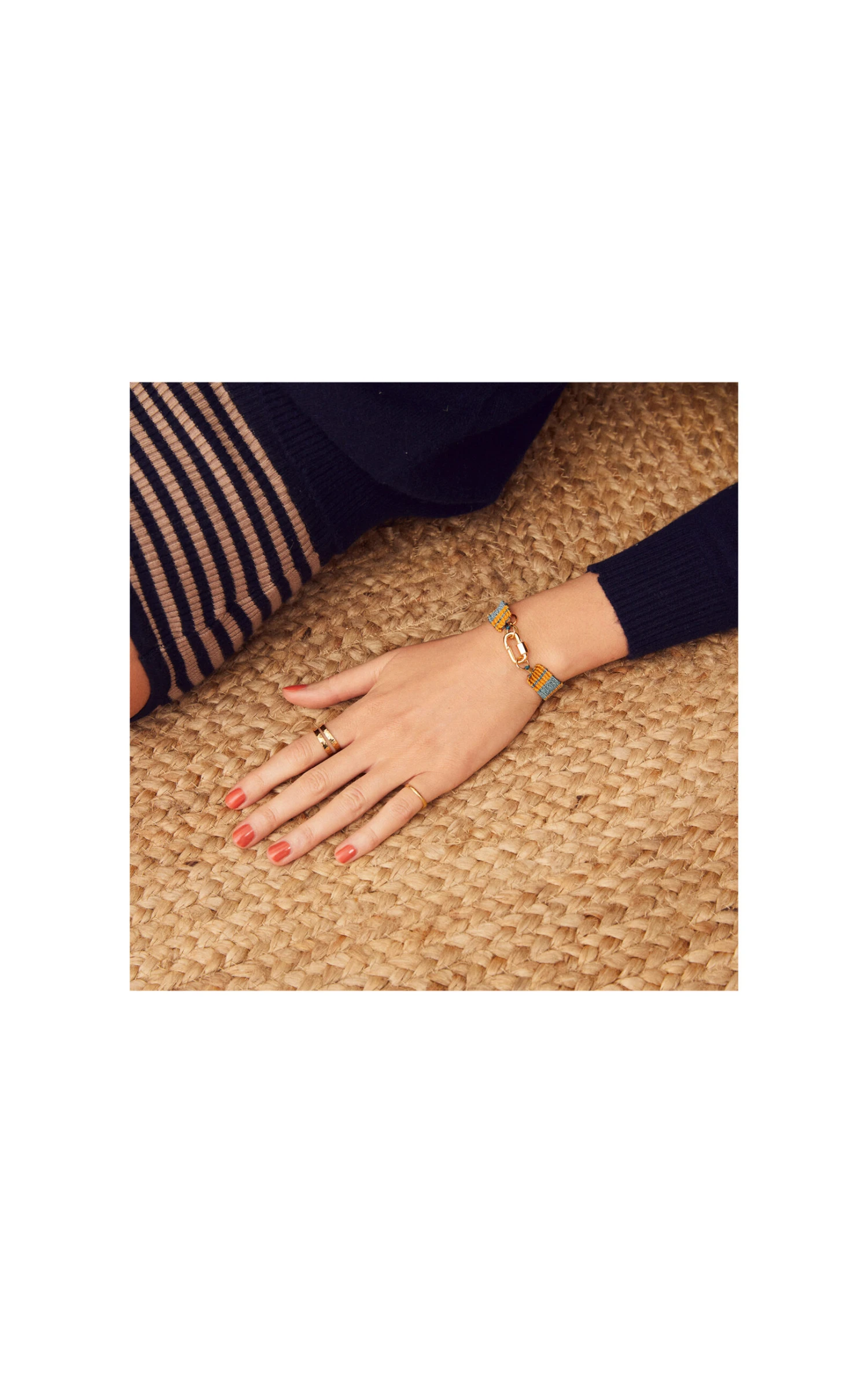 Lien entièrement tissé à la main de fil très fin de couleur turquoise fonçé, bleu canard et bronze. Décoré de trois pampilles dorées en son centre, pavées de strass effet diamant. À associer avec les fermoirs « LOCKETS ».