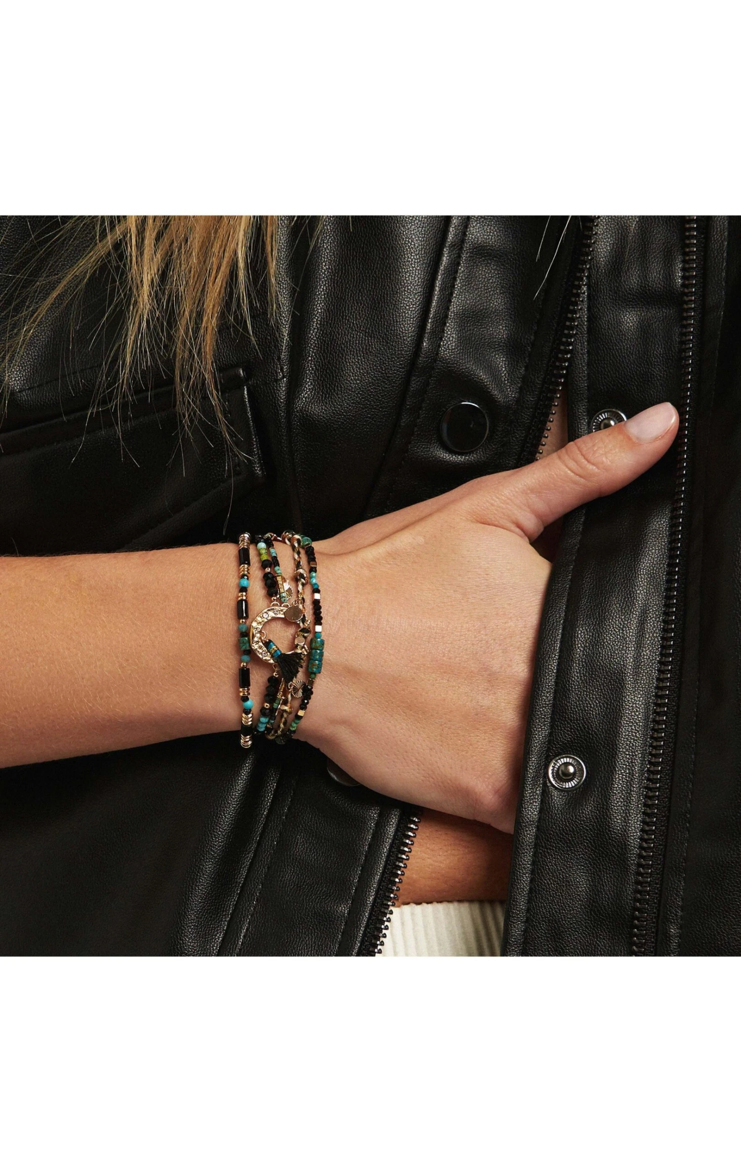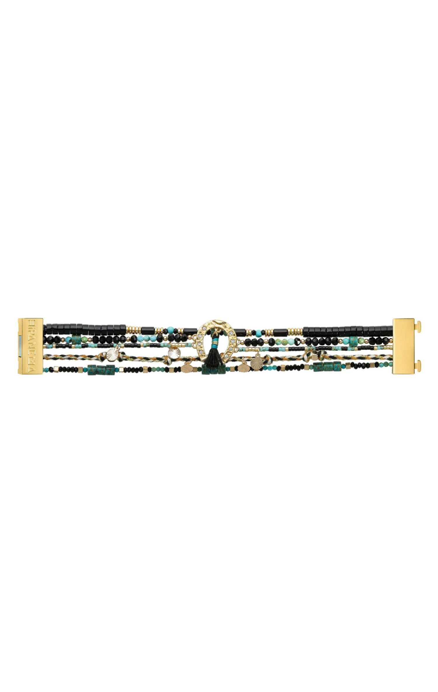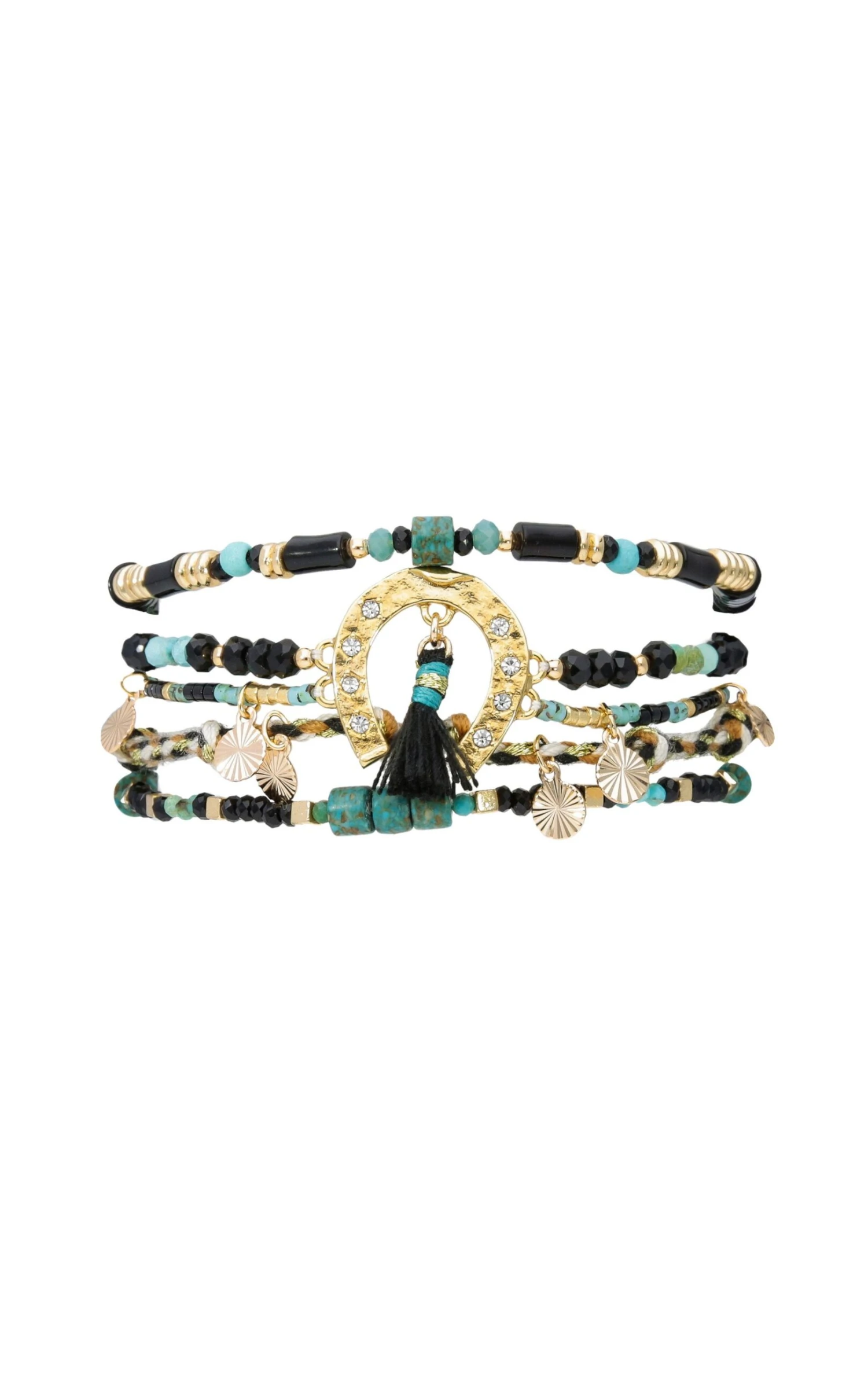 AnnĂ©e après annĂ©e, nous vous proposons des manchettes toujours plus exceptionnelles! Ce bracelet dans les tons turquoise, noir, dorĂ©, et vert jade est composĂ© de six liens en pierres semi-prĂ©cieuses et perles de verre rĂ©haussĂ©es de multiples pampilles dorĂ©es Ă l’or fin 14 carats. Son style Navajo ornĂ© d’un fer Ă cheval porte-bonheur en son centre, sera votre bijou fĂ©tiche cette saison. Vous allez adorer son esprit ethnique chic.