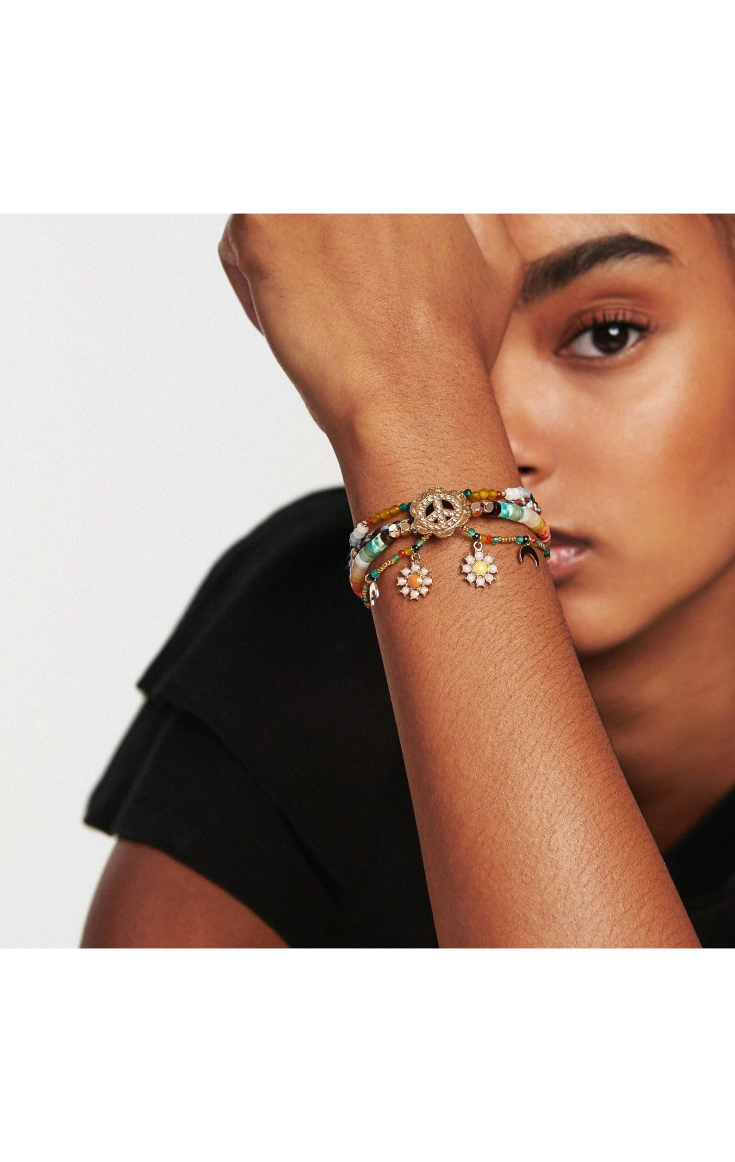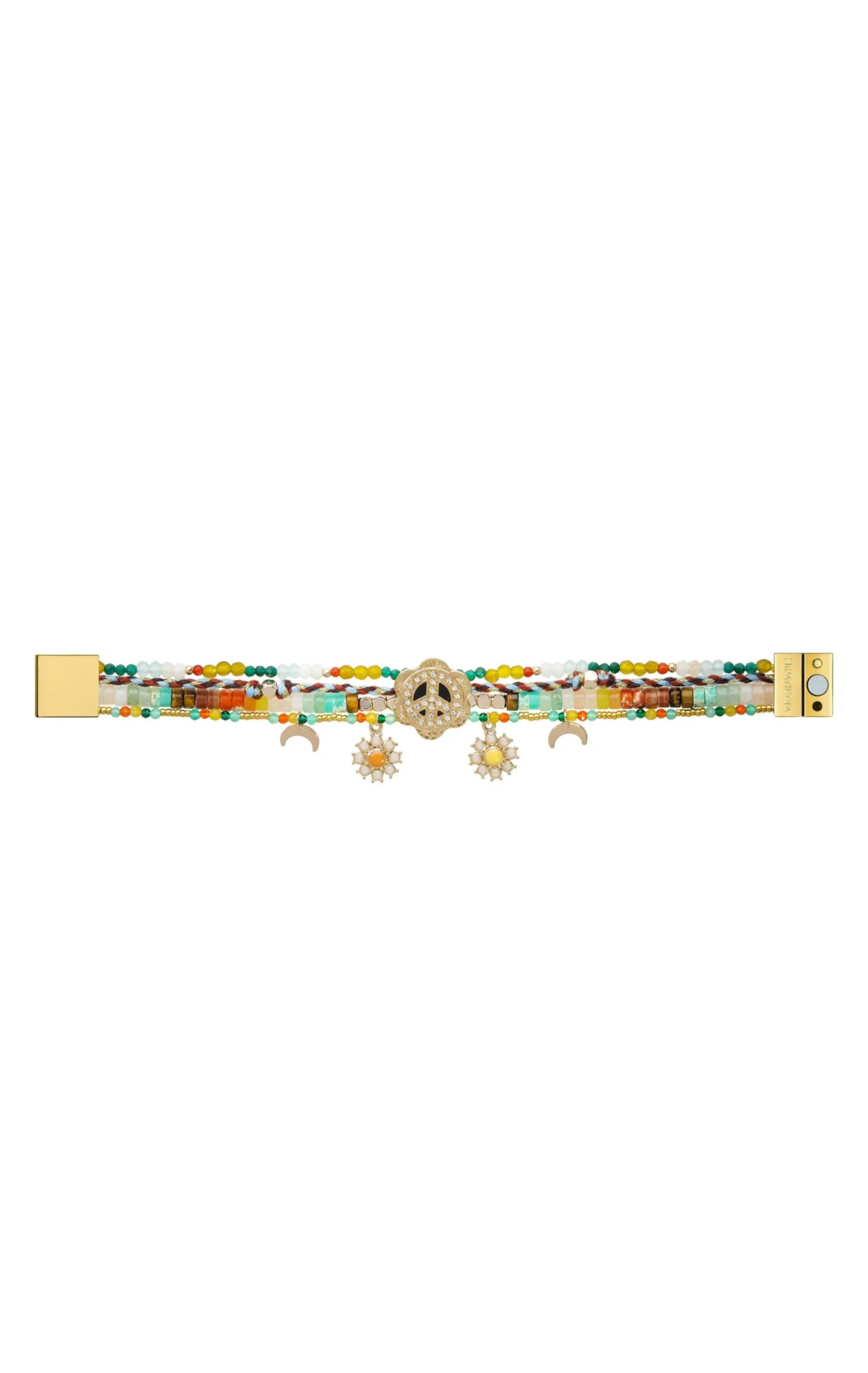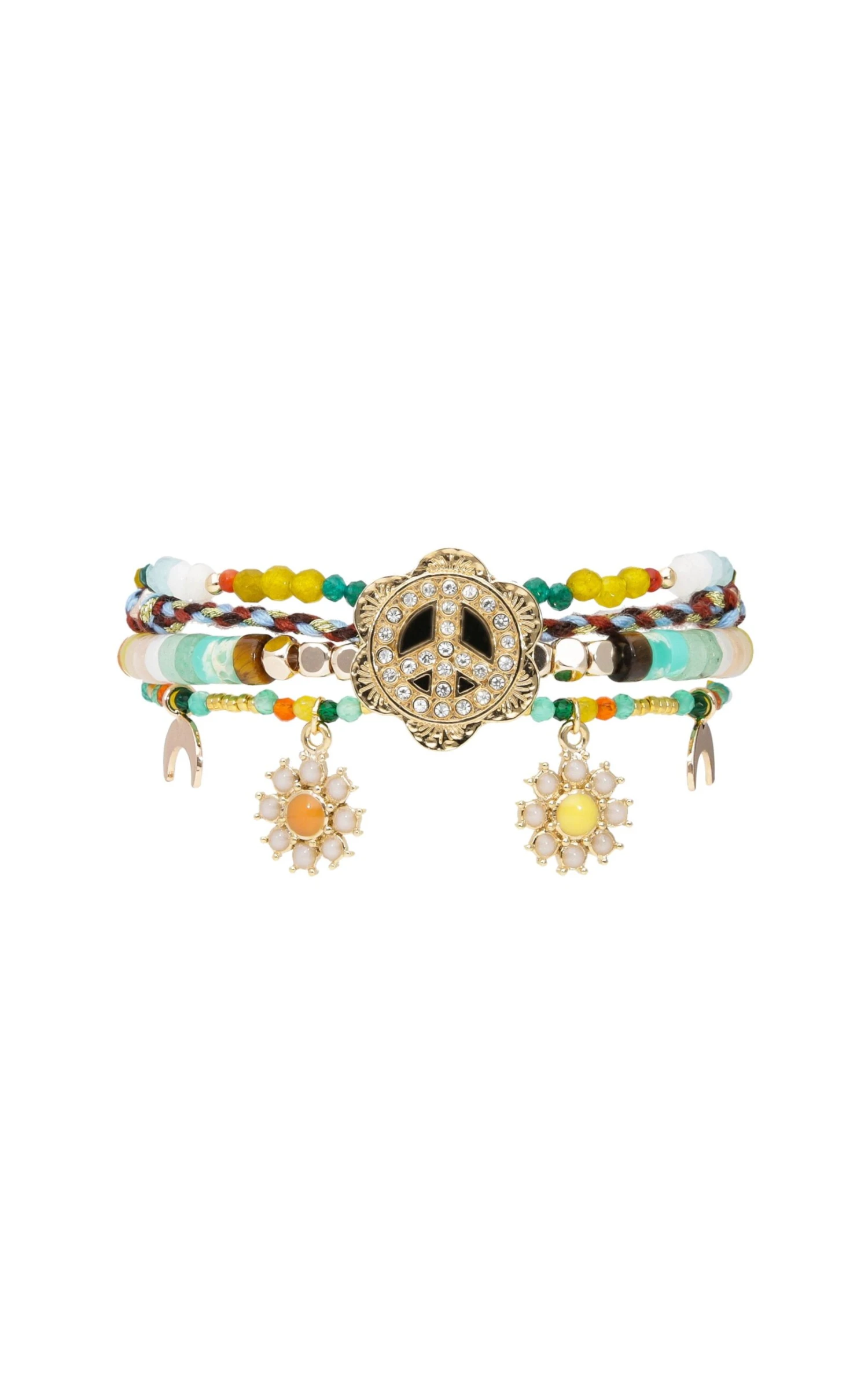 Cette manchette dorée à l’or fin 14 carats est un rayon de soleil en hiver! Vous allez adorer ses quatre liens colorés dans les tons coucher de soleil, jaune d’or, vert émeraude, quartz blanc, bleu pastel et orange feu, qui donnent à cette pièce un look précieux et coloré. On aime particulièrement son côté baroque et joyeux avec le symbole centrale Peace and love pavé de strass effet diamant et les petites pampilles breloques en forme de marguerite. Chaque saison Hipanema crée des manchettes plus exceptionnelles les unes que les autres. On adore le style Navajo revisité qui rend ce bracelet atypique et féminin.