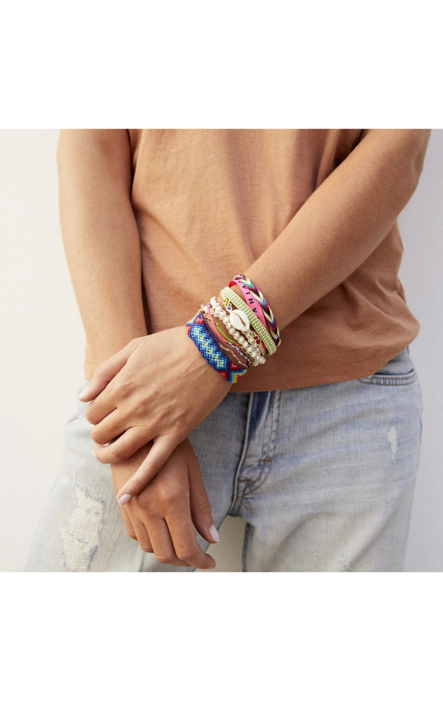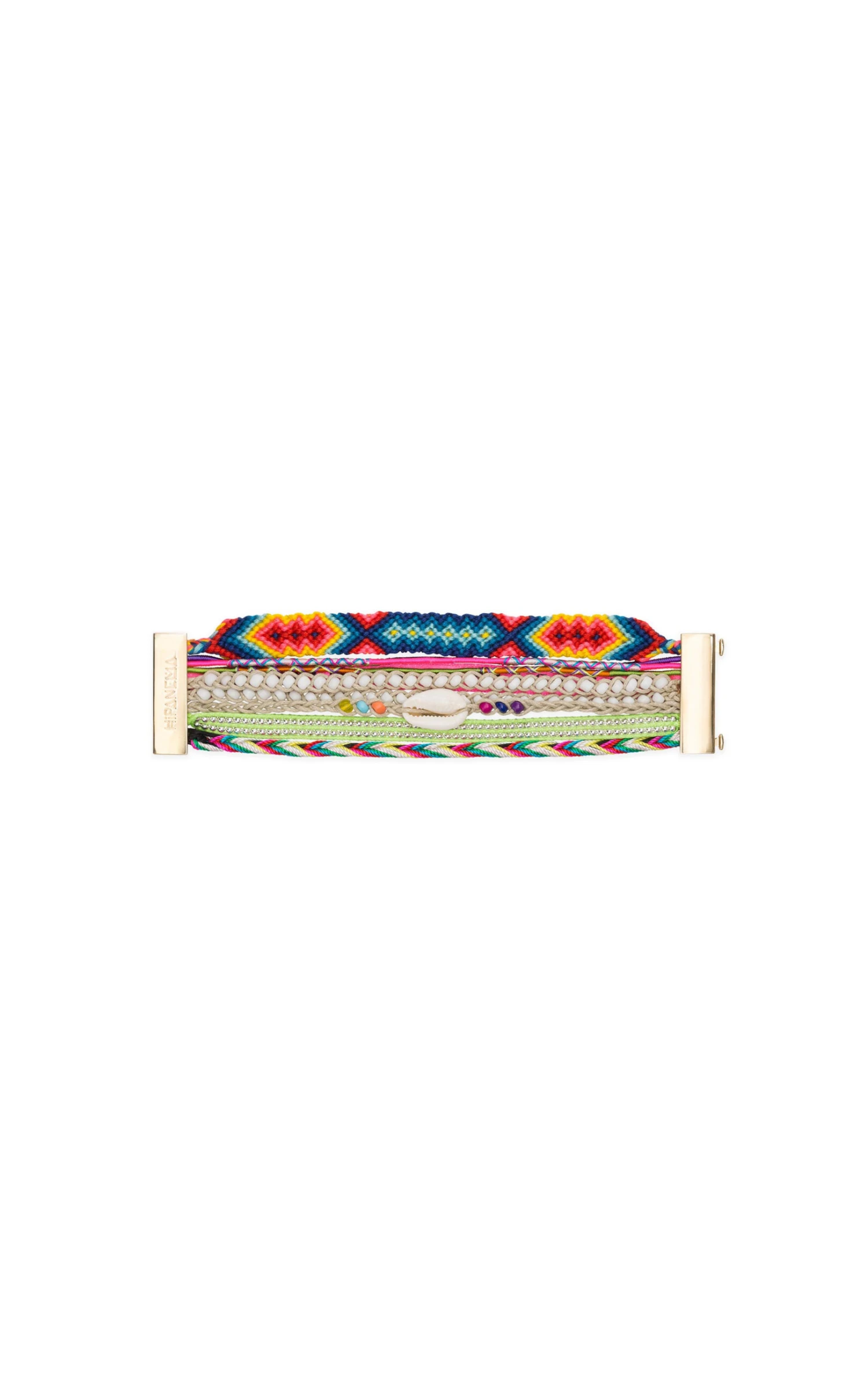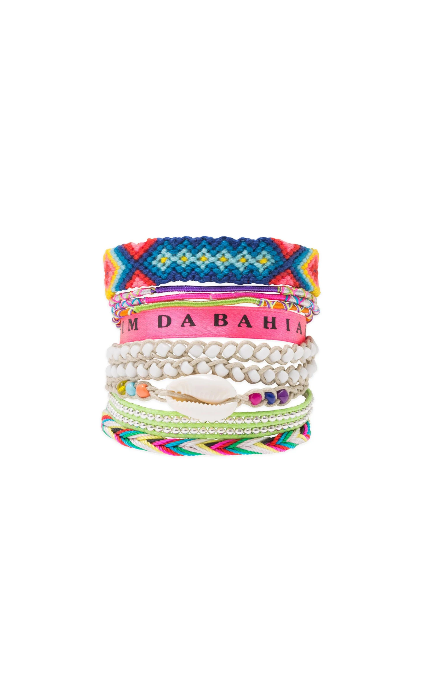 Ici est présenté la manchette « Version 01 », composée de liens de coton multicolores, d’un bracelet brésilien tressé dans les tons arc-en-ciel, d’un coquillage cowrie et du légendaire ruban sehnor da bonfim porte-bonheur.