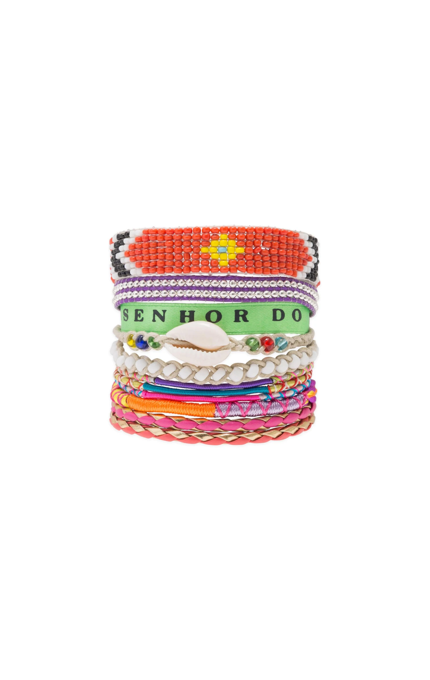 Ici est présenté la manchette « Version 02 », composée de liens de coton multicolores, d’un bracelet brésilien en perles orange, blanc et noir, d’un coquillage cowrie et du légendaire ruban sehnor da bonfim porte-bonheur.