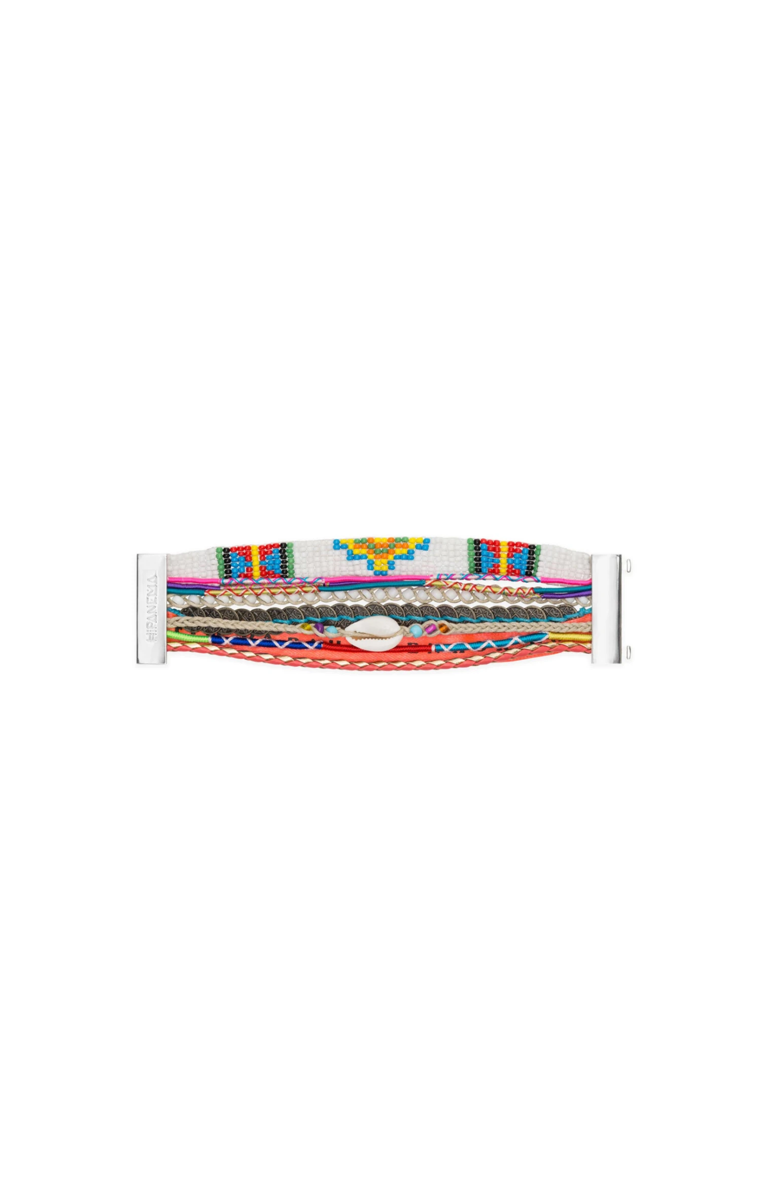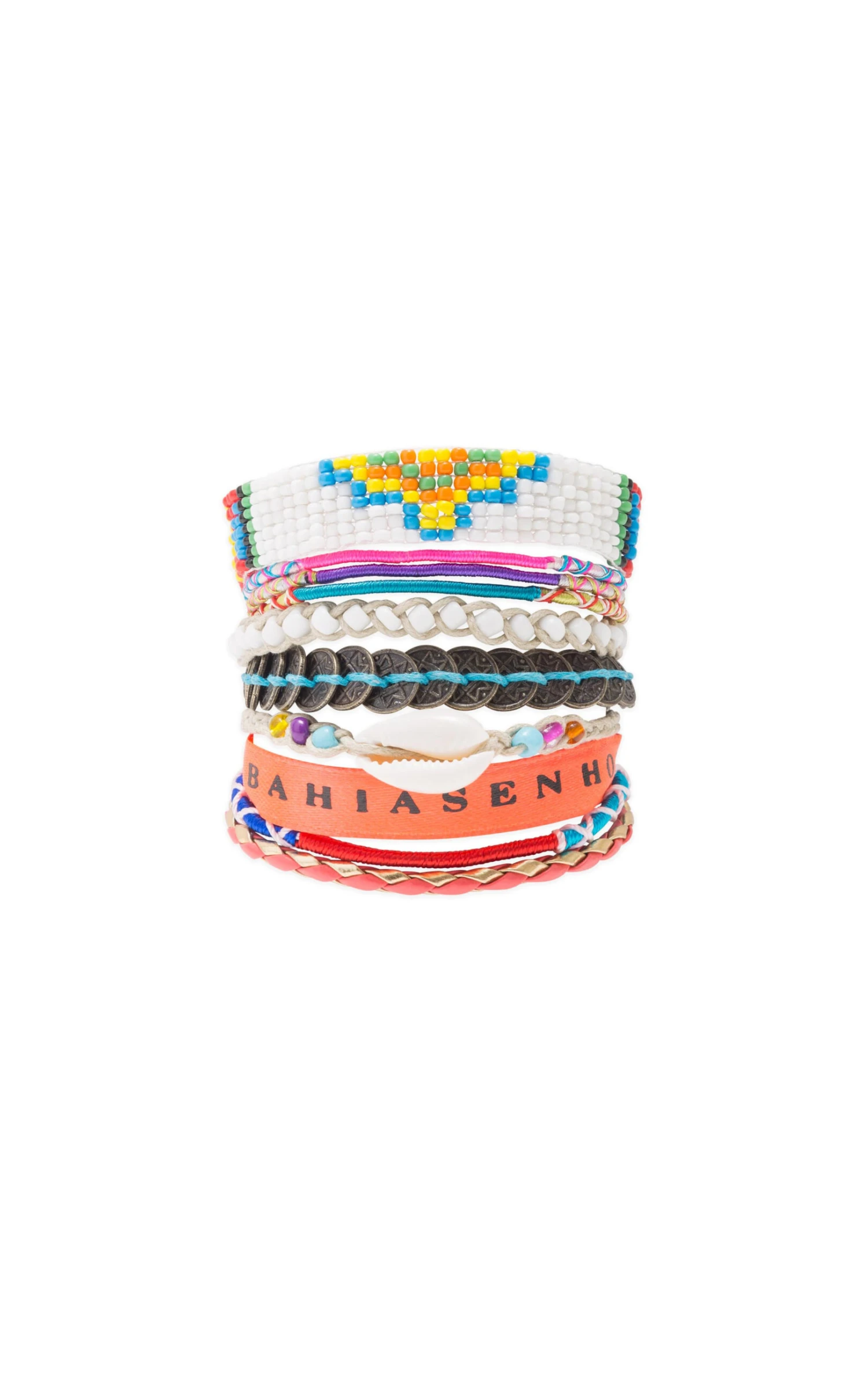 Ici est présenté la manchette « Version 03 », composée de liens de coton multicolores, d’un bracelet brésilien en perles blanc, rouge, vert et bleu, d’un coquillage cowrie et du légendaire ruban sehnor da bonfim porte-bonheur.