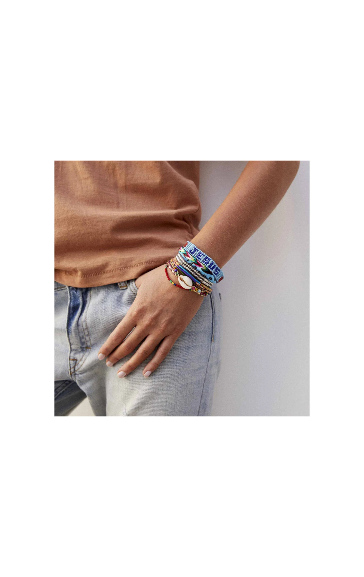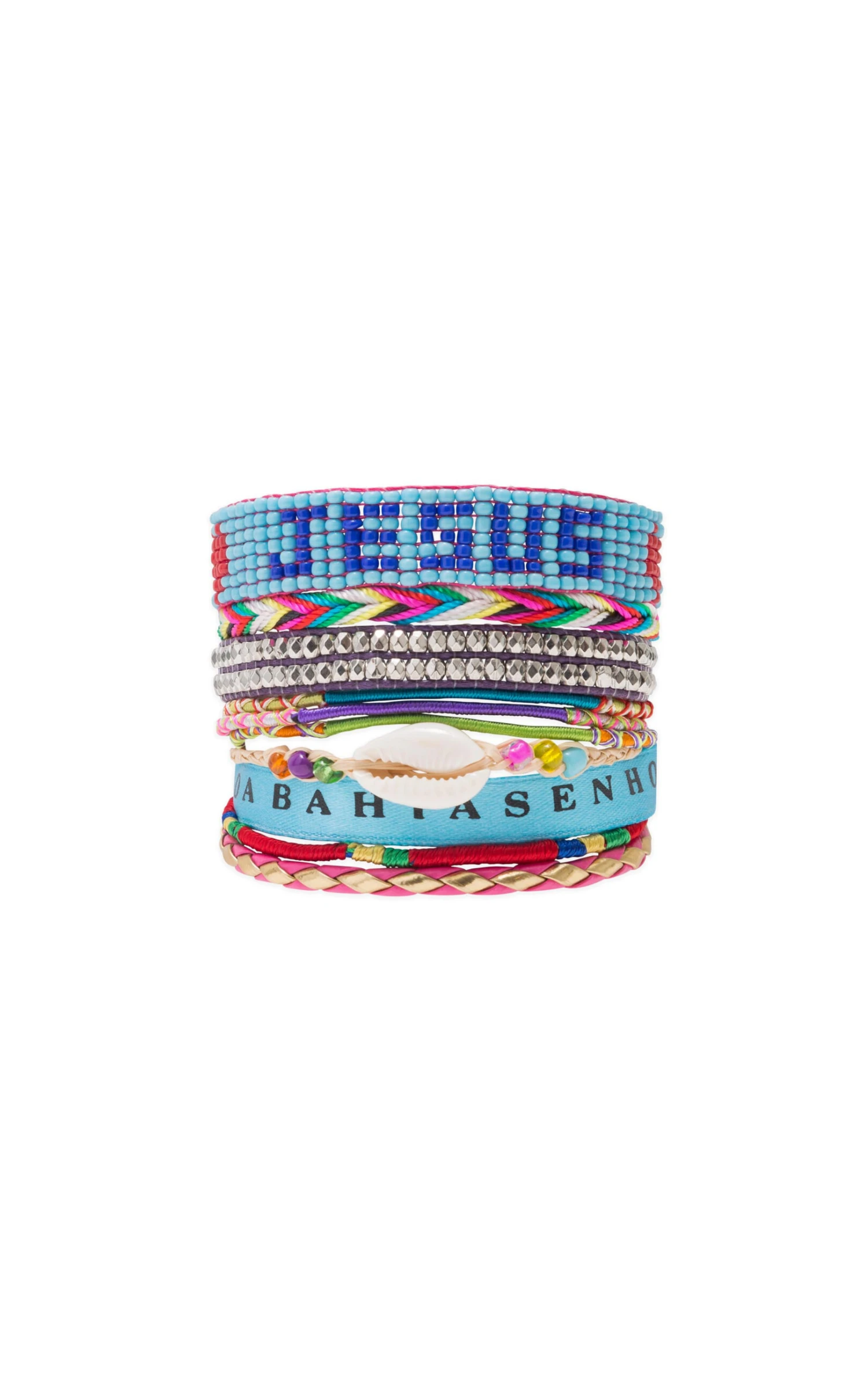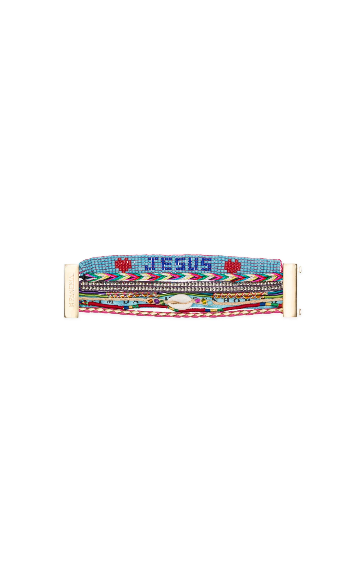 Ici est prĂ©sentĂ© la manchette « Version 04 », composĂ©e de liens de coton multicolores, d’un bracelet brĂ©silien en perles bleu, rouge et violet avec en son centre inscrit « jesus », d’un coquillage cowrie et du lĂ©gendaire ruban sehnor da bonfim porte-bonheur.