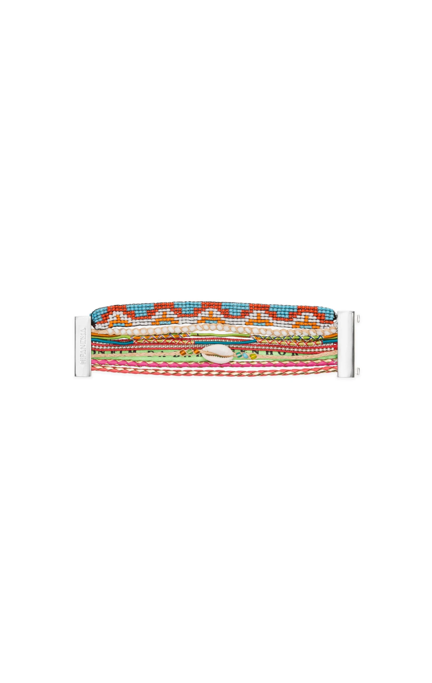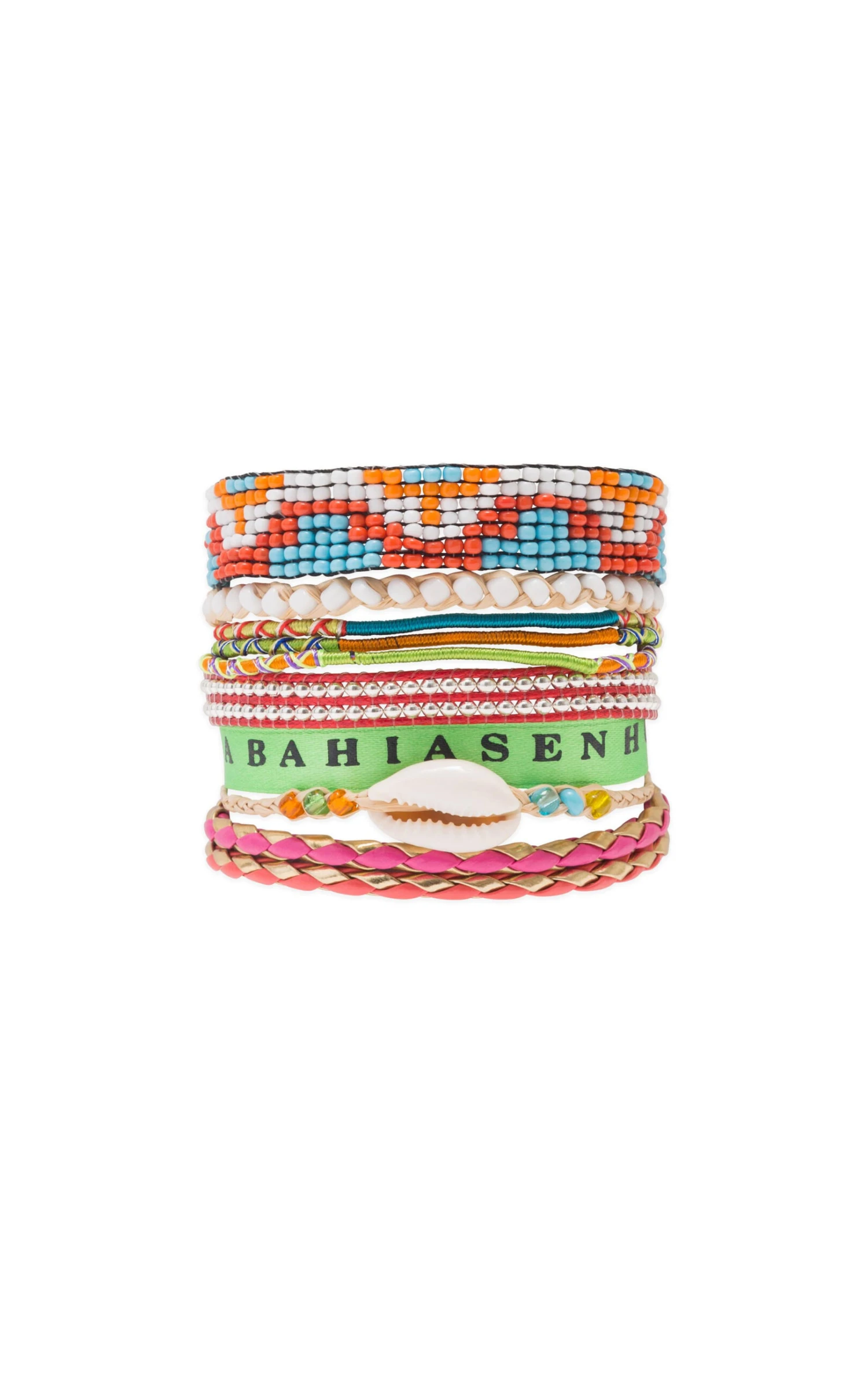 Ici est présenté la manchette « Version 06 », composée de liens de coton multicolores, d’un bracelet brésilien en perles orange, rouge, blanc et turquoise, d’un coquillage cowrie et du légendaire ruban sehnor da bonfim porte-bonheur.